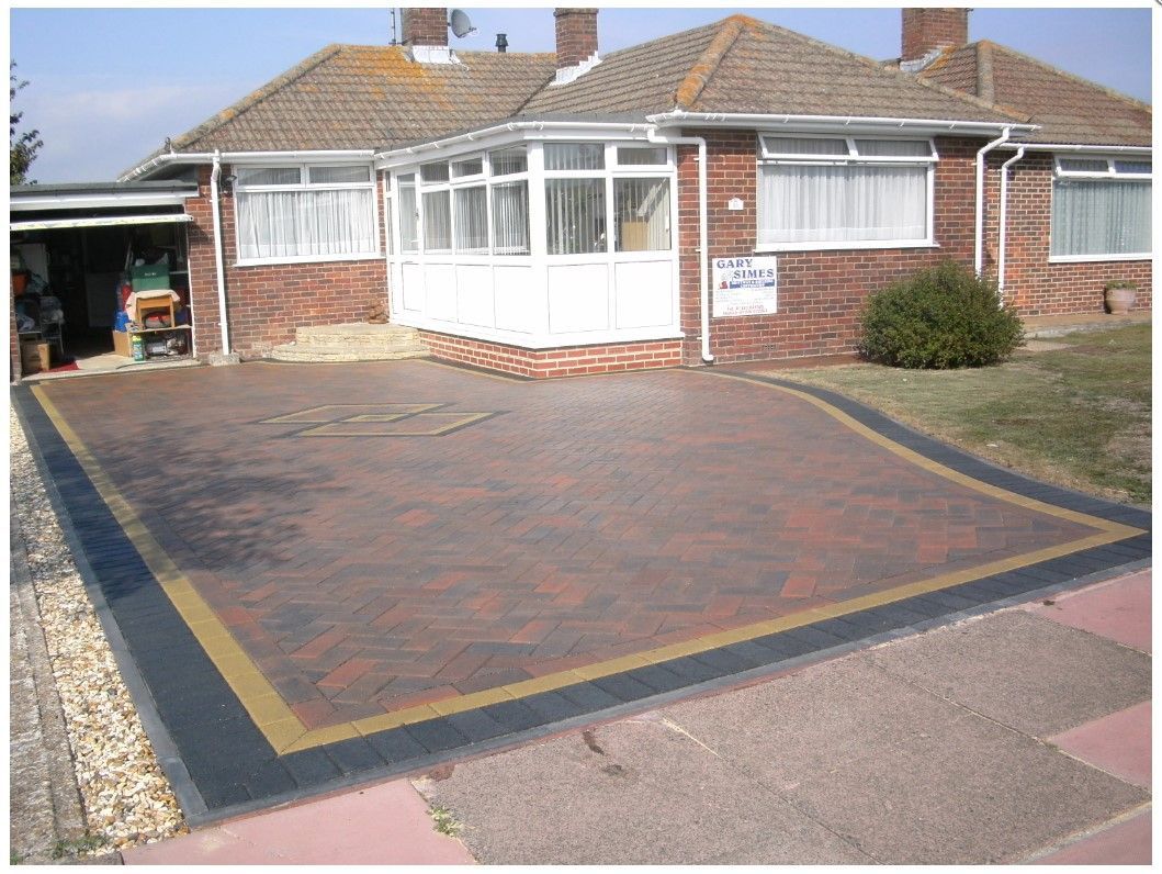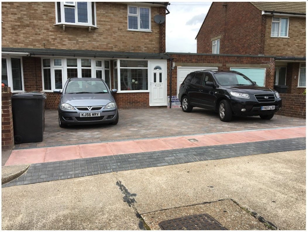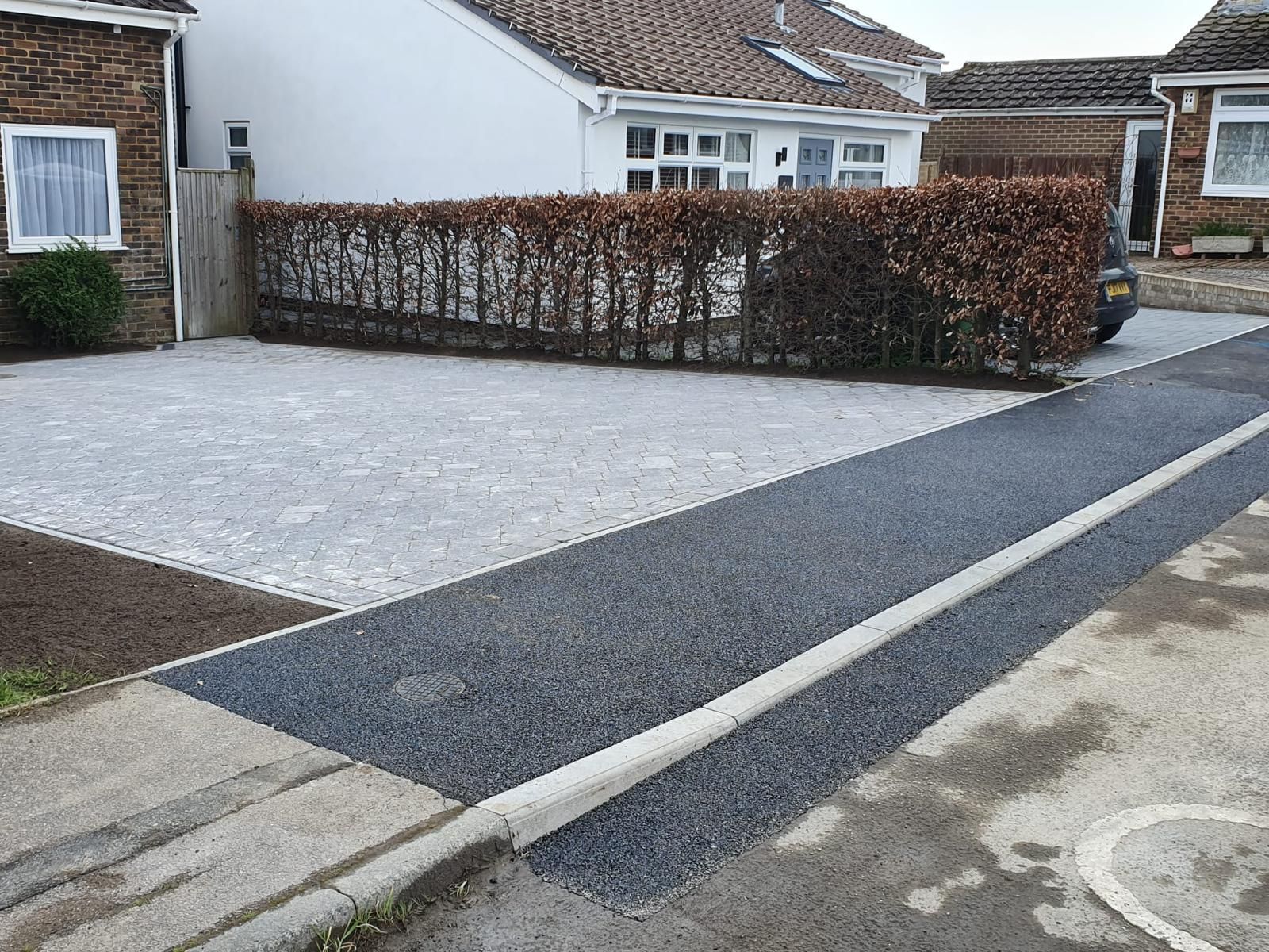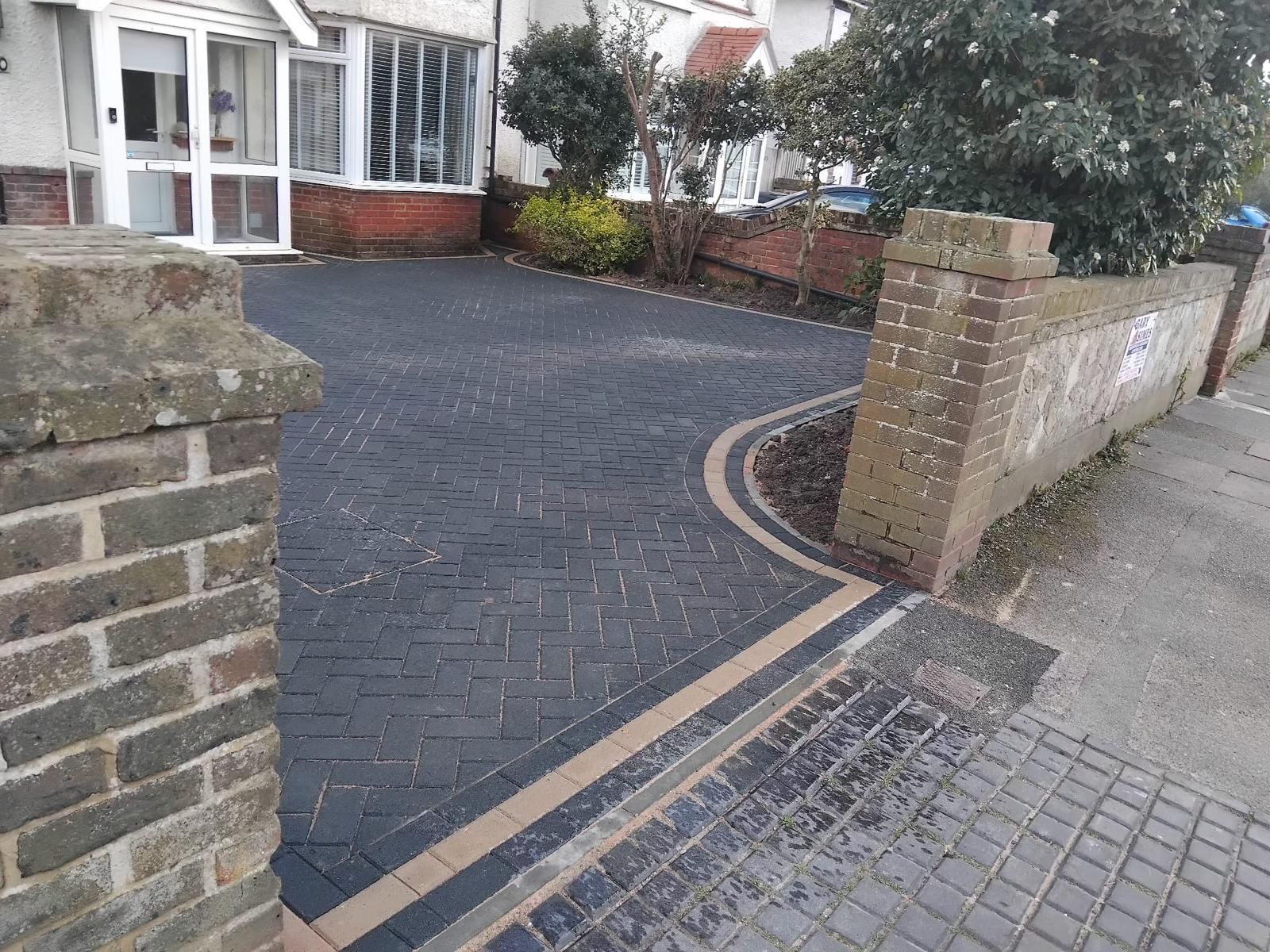 Standard brindle block paved driveway with charcoal border and dropped kerb.