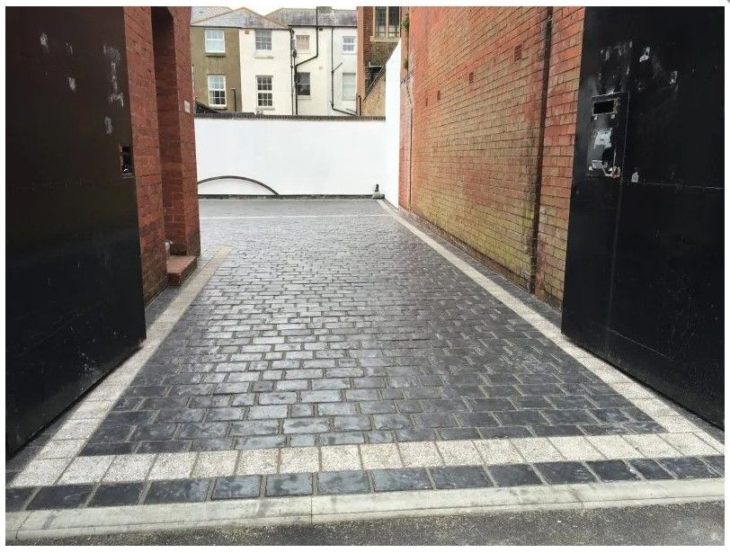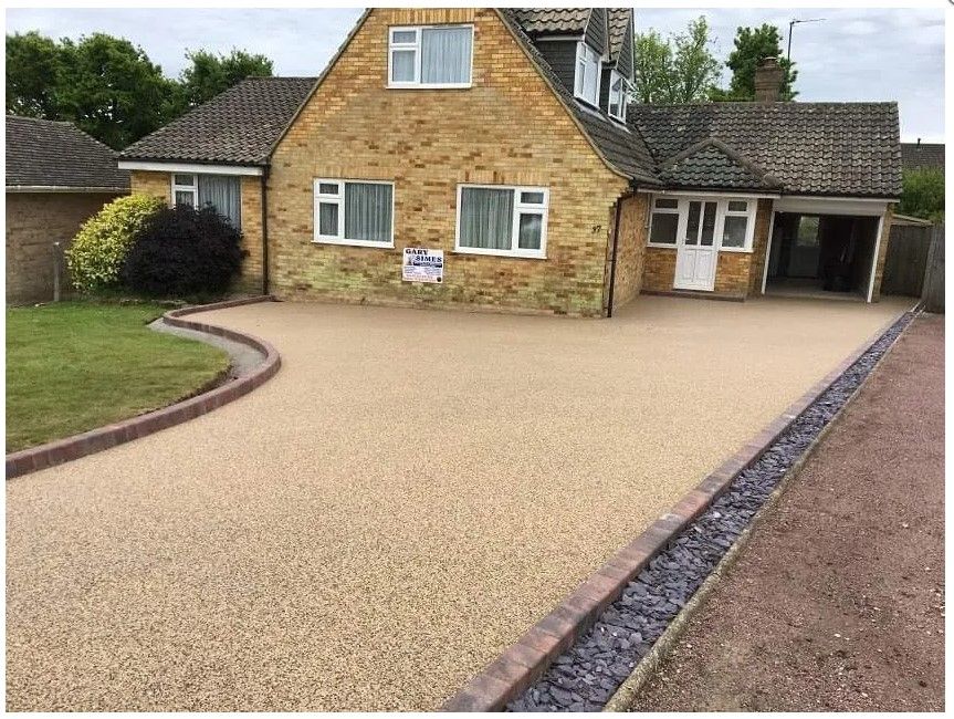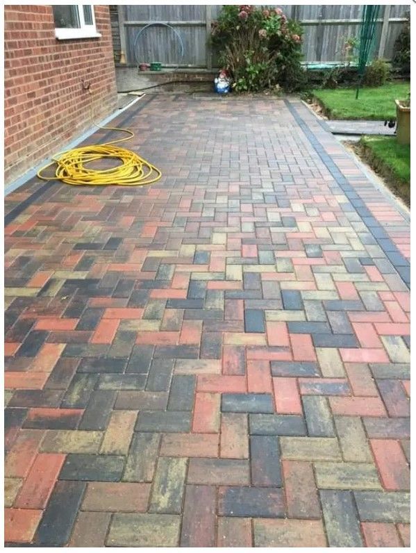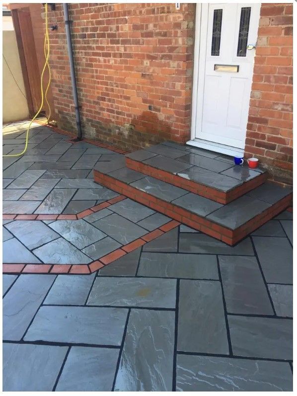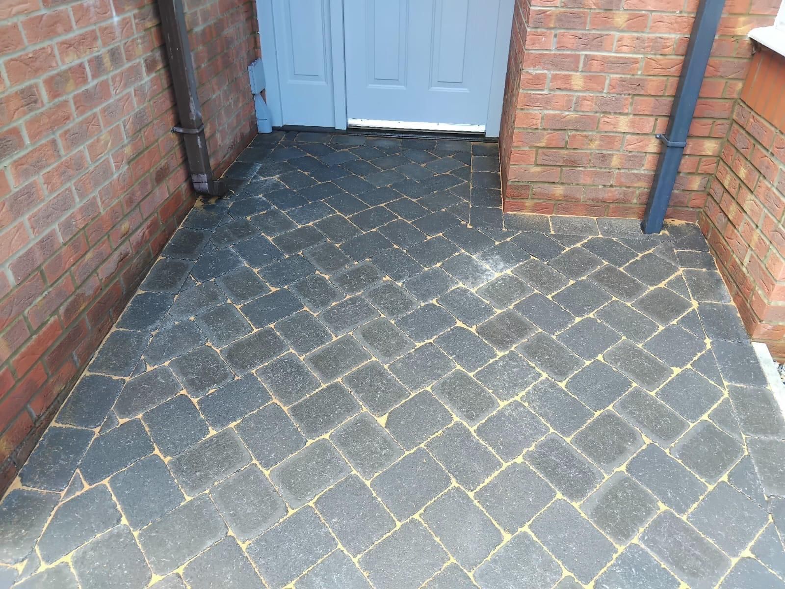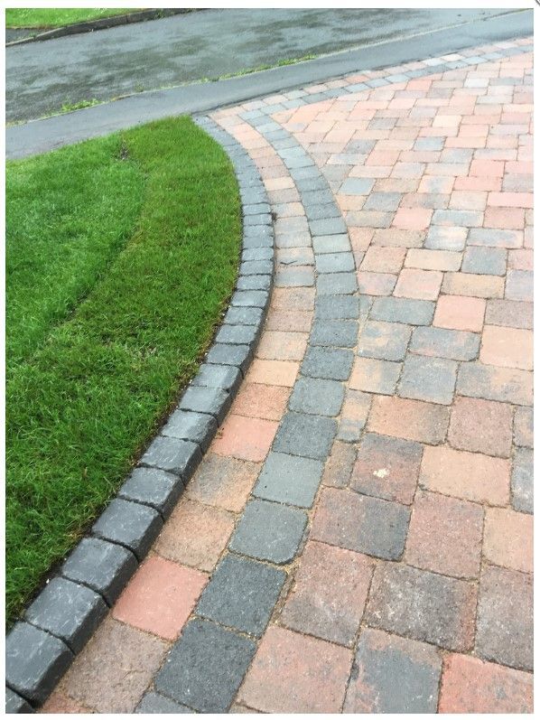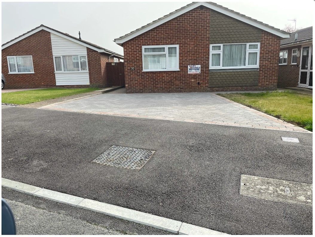Standard brindle block paved driveway with charcoal border and dropped kerb.