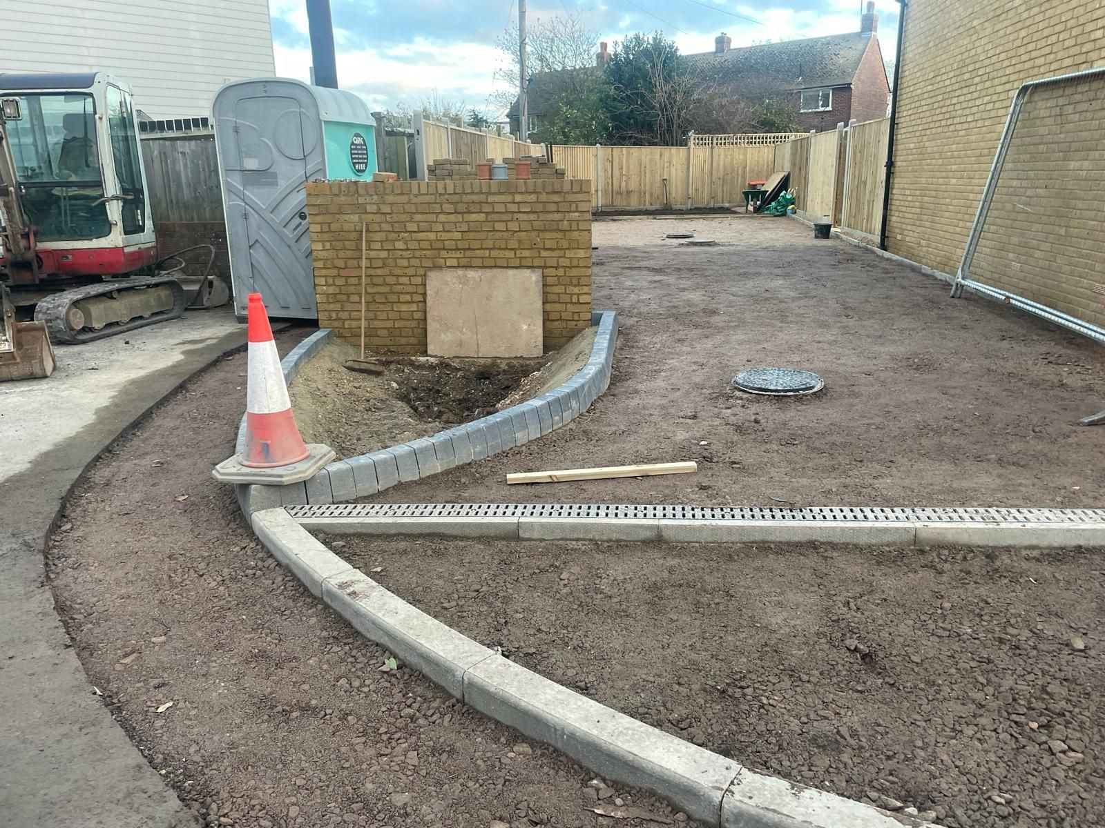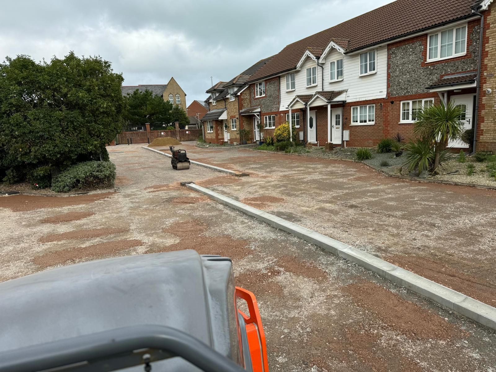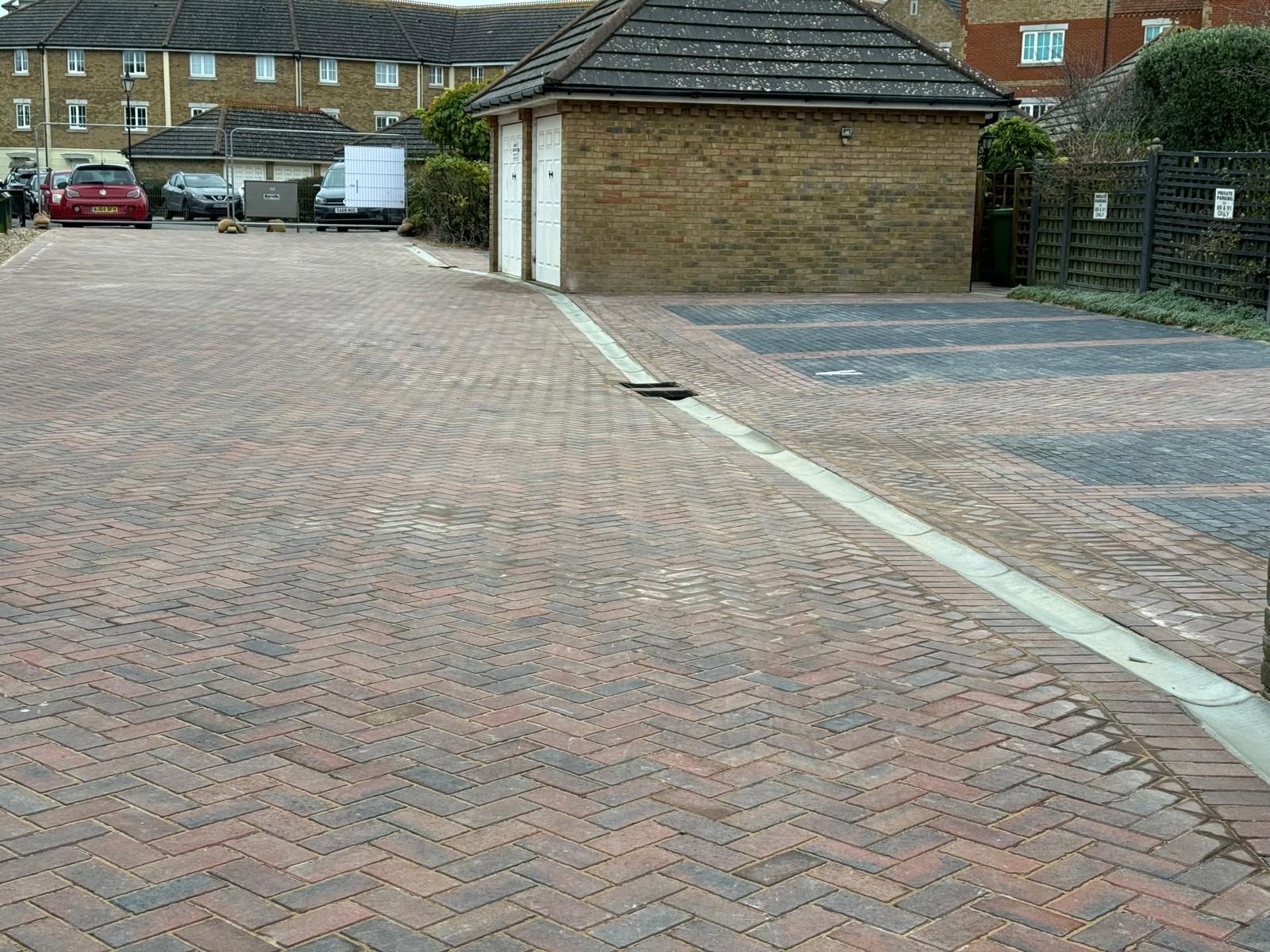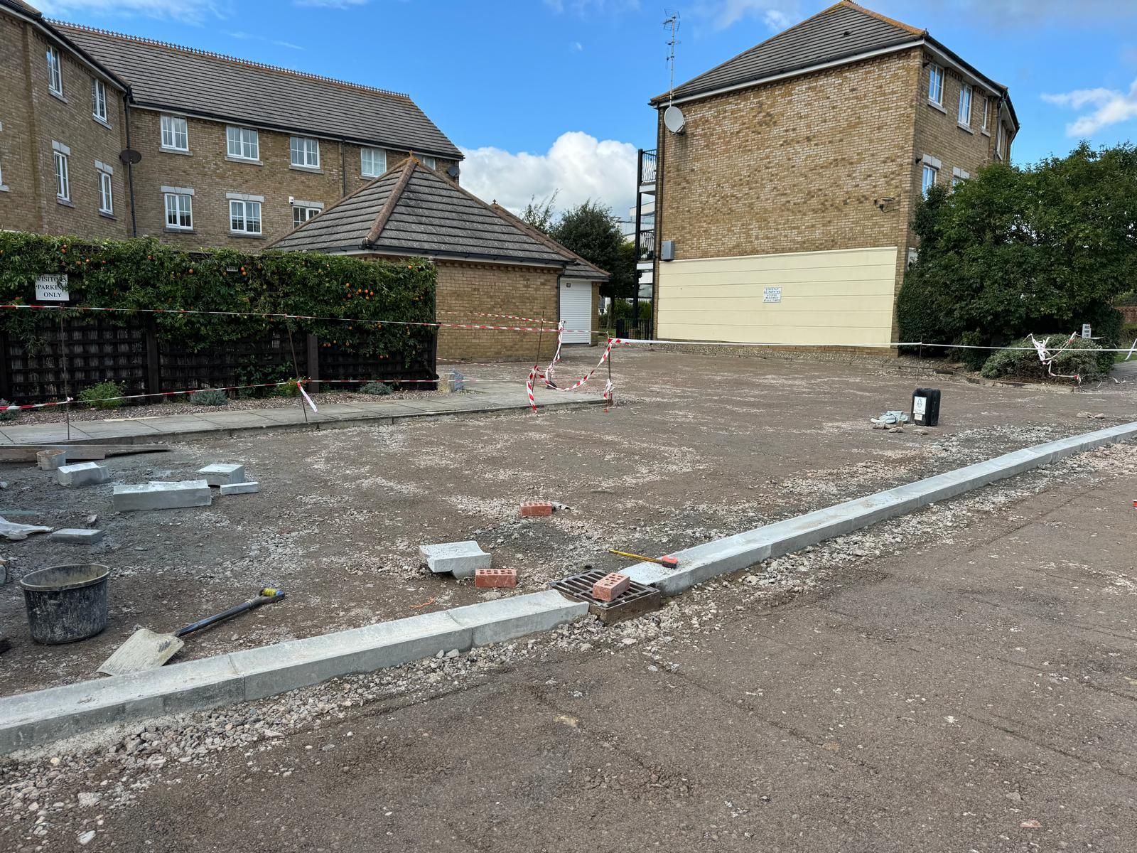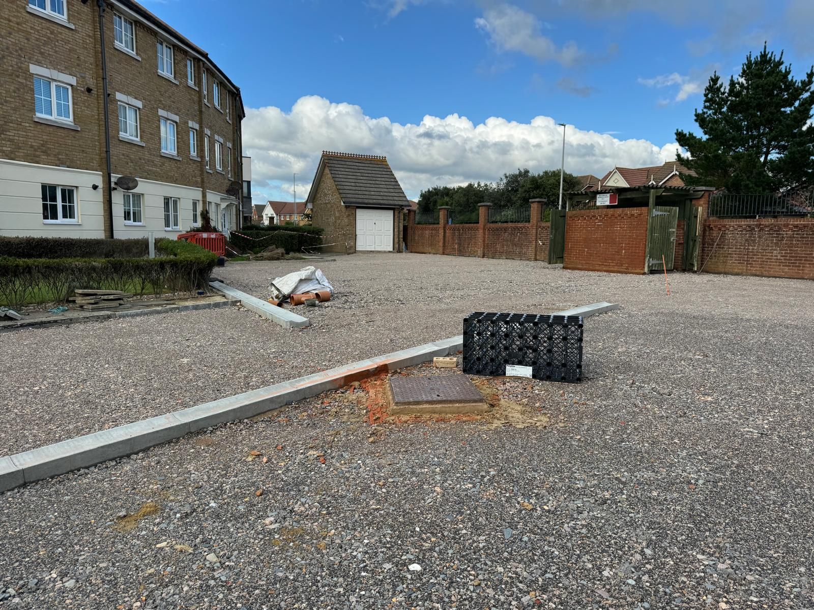 Photos of the 1200 square metre car park showing soakaways, road gully’s, channel dish drainage units, sub base and 60mm block paving and parking bays with visitor bays.