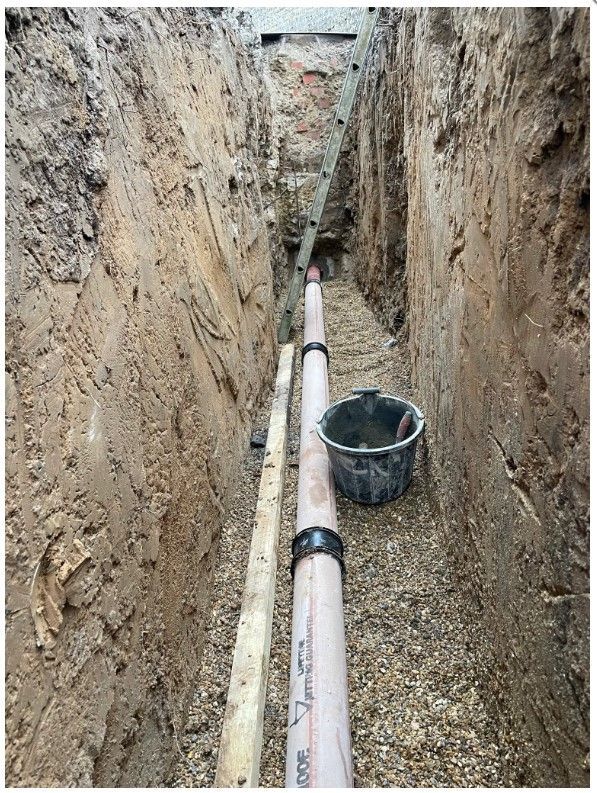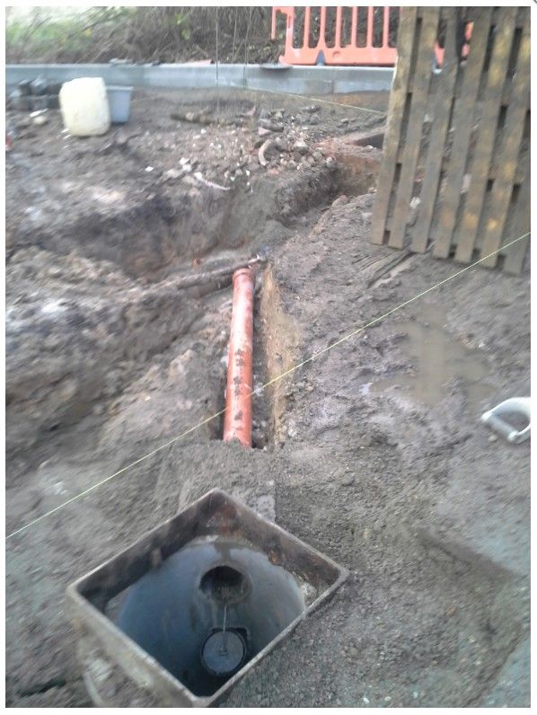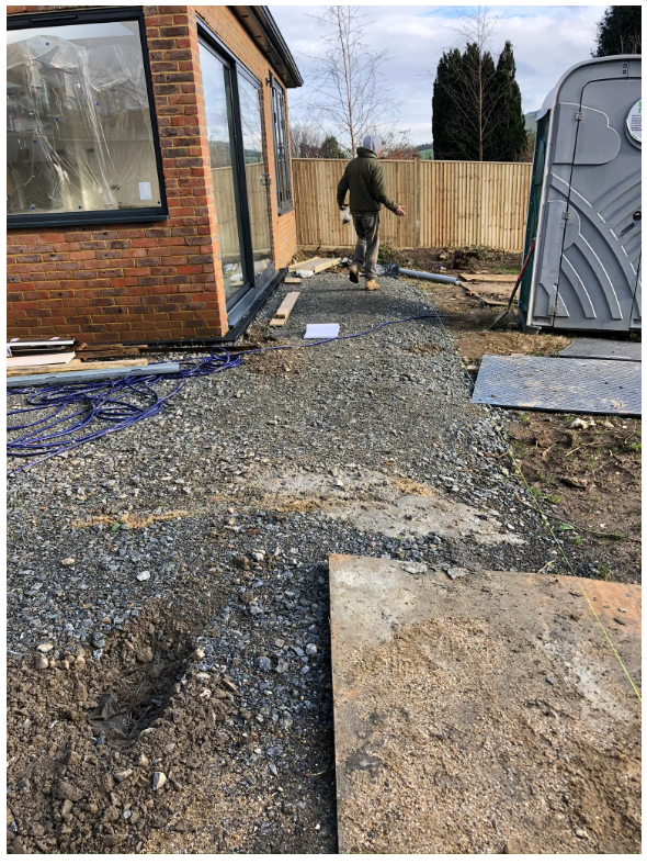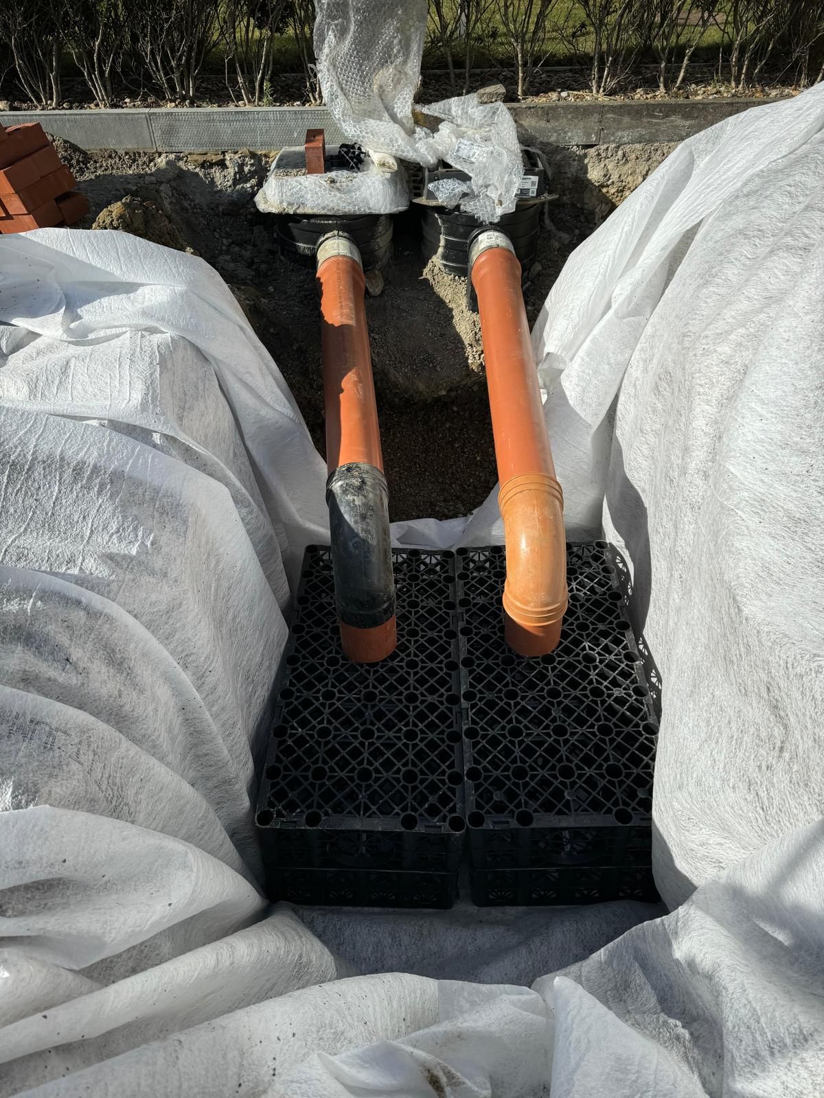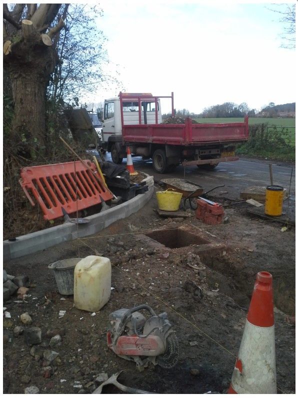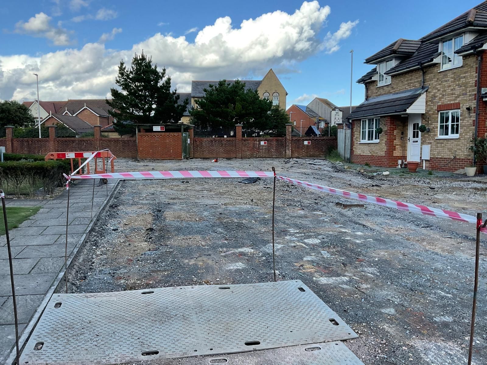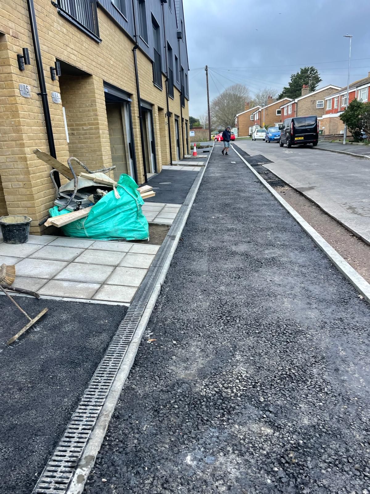 Photos of the 1200 square metre car park showing soakaways, road gully’s, channel dish drainage units, sub base and 60mm block paving and parking bays with visitor bays.