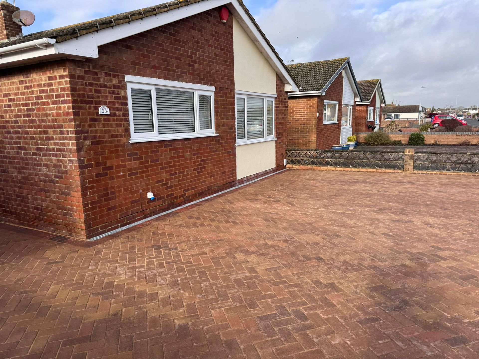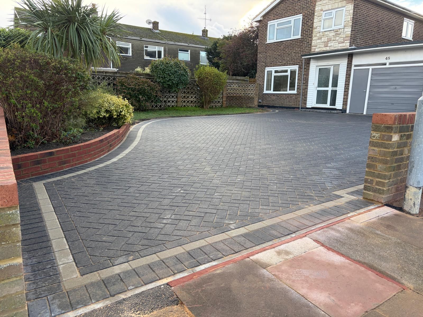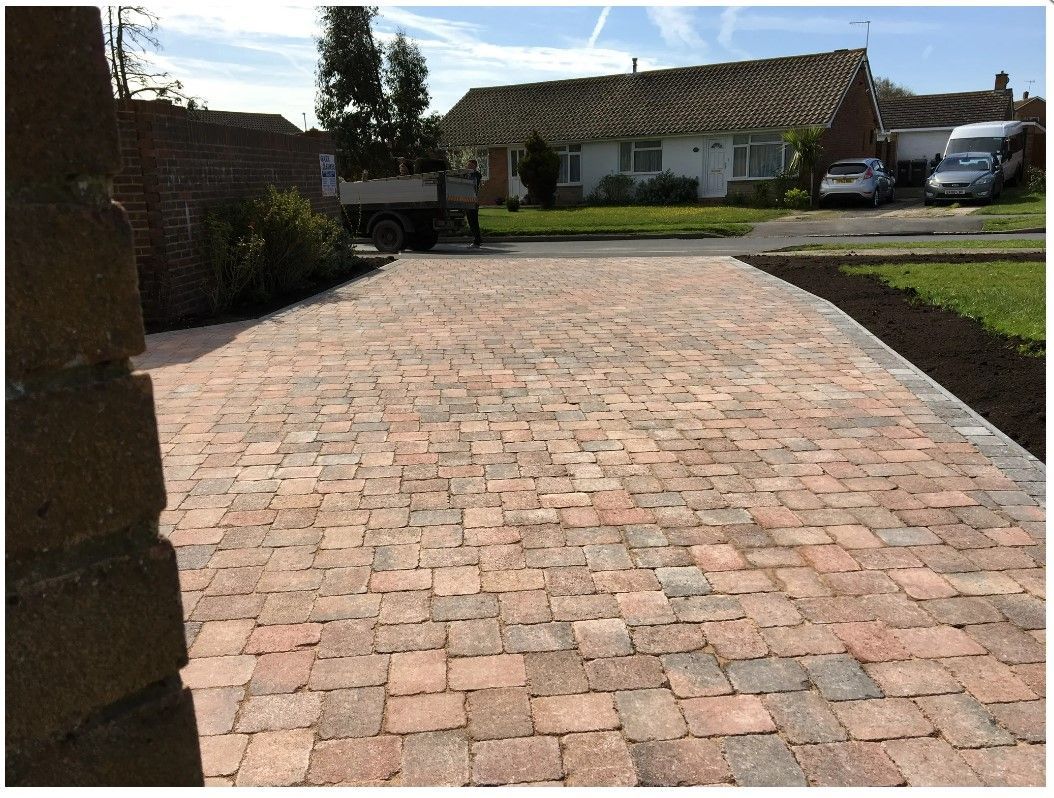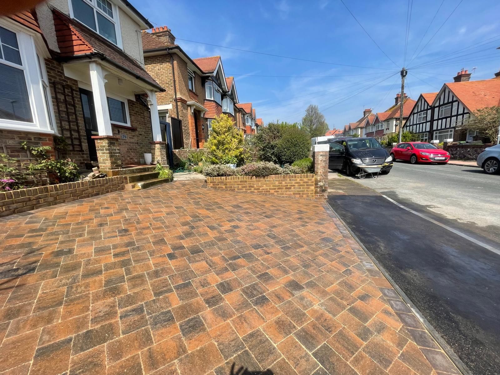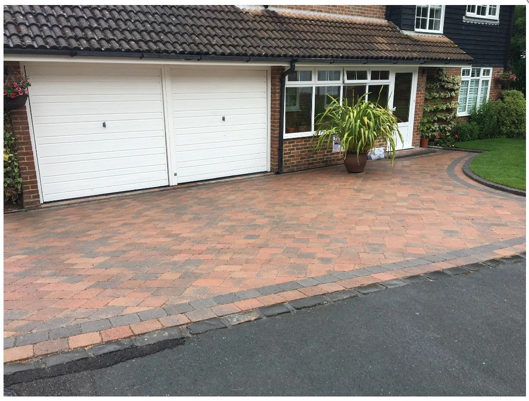 A nice standard brindle block paved driveway in Hailsham, East Sussex with raised border edge blocks.