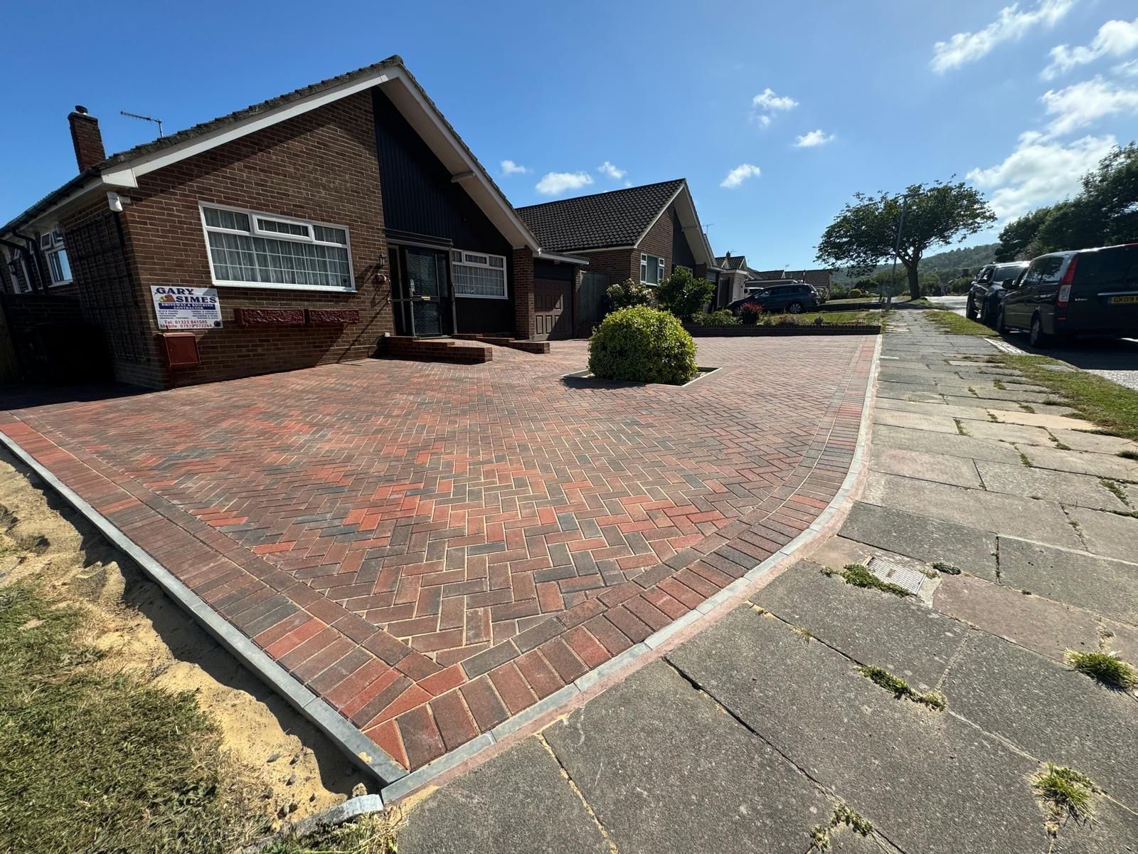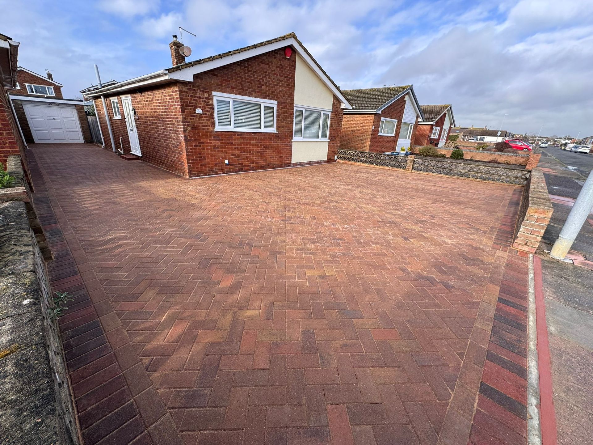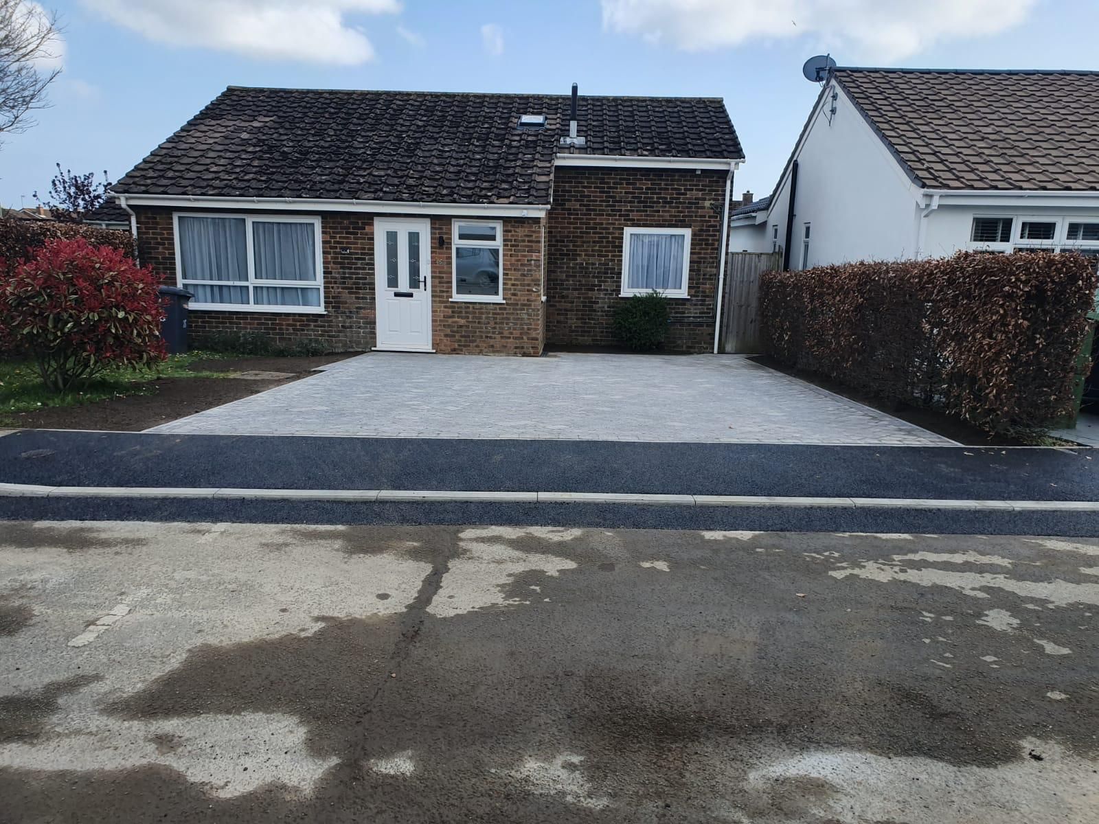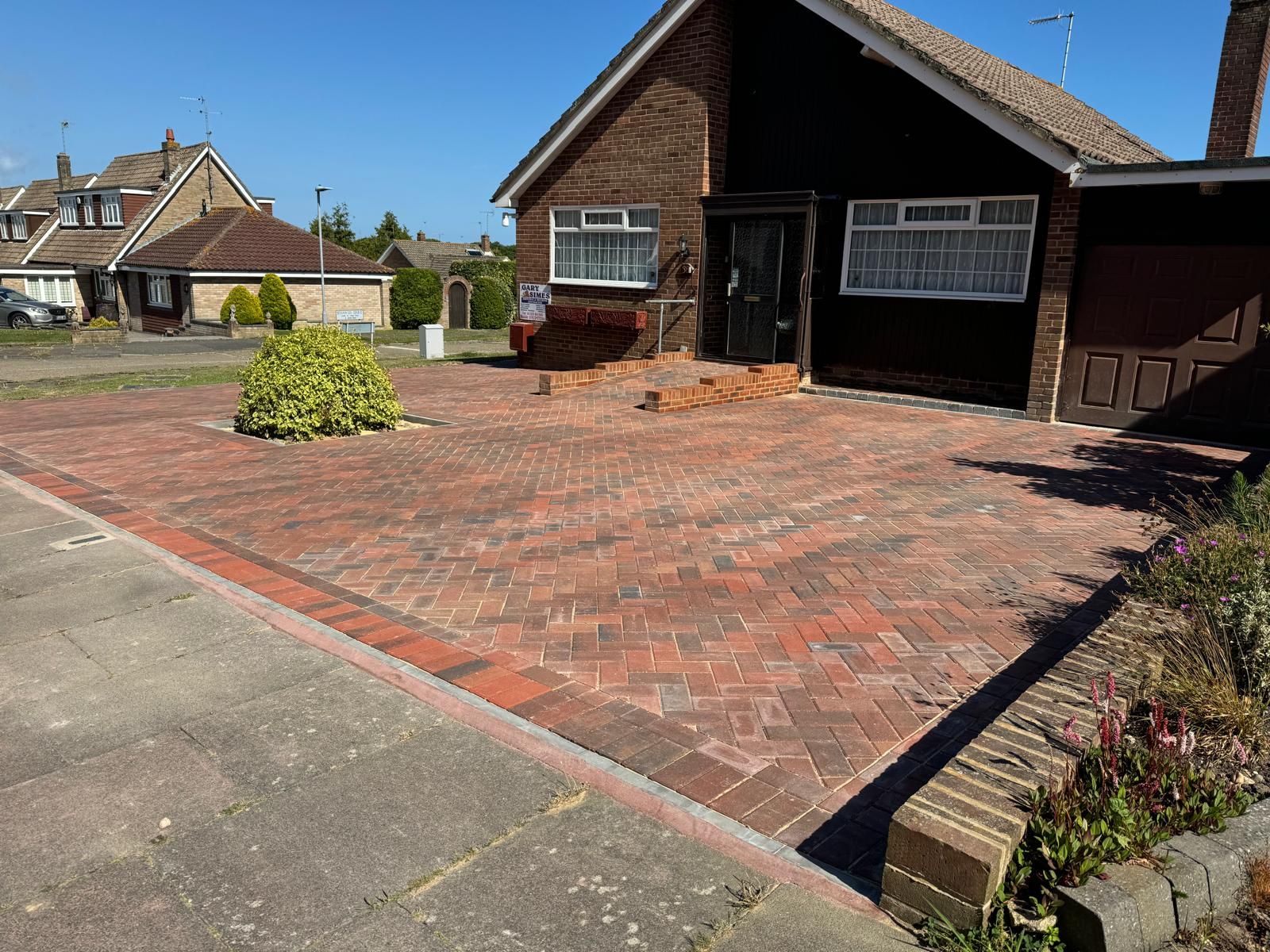 A nice standard brindle block paved driveway in Hailsham, East Sussex with raised border edge blocks.