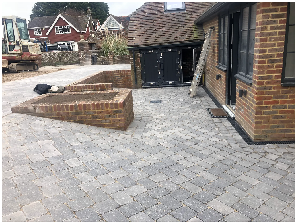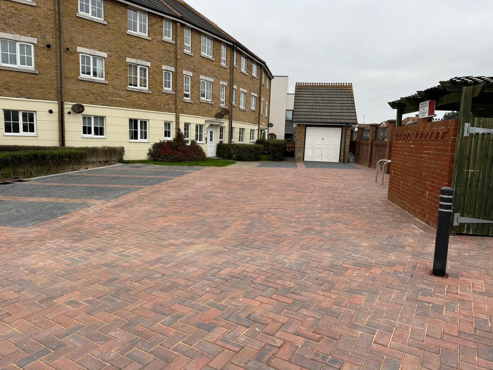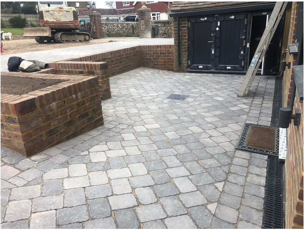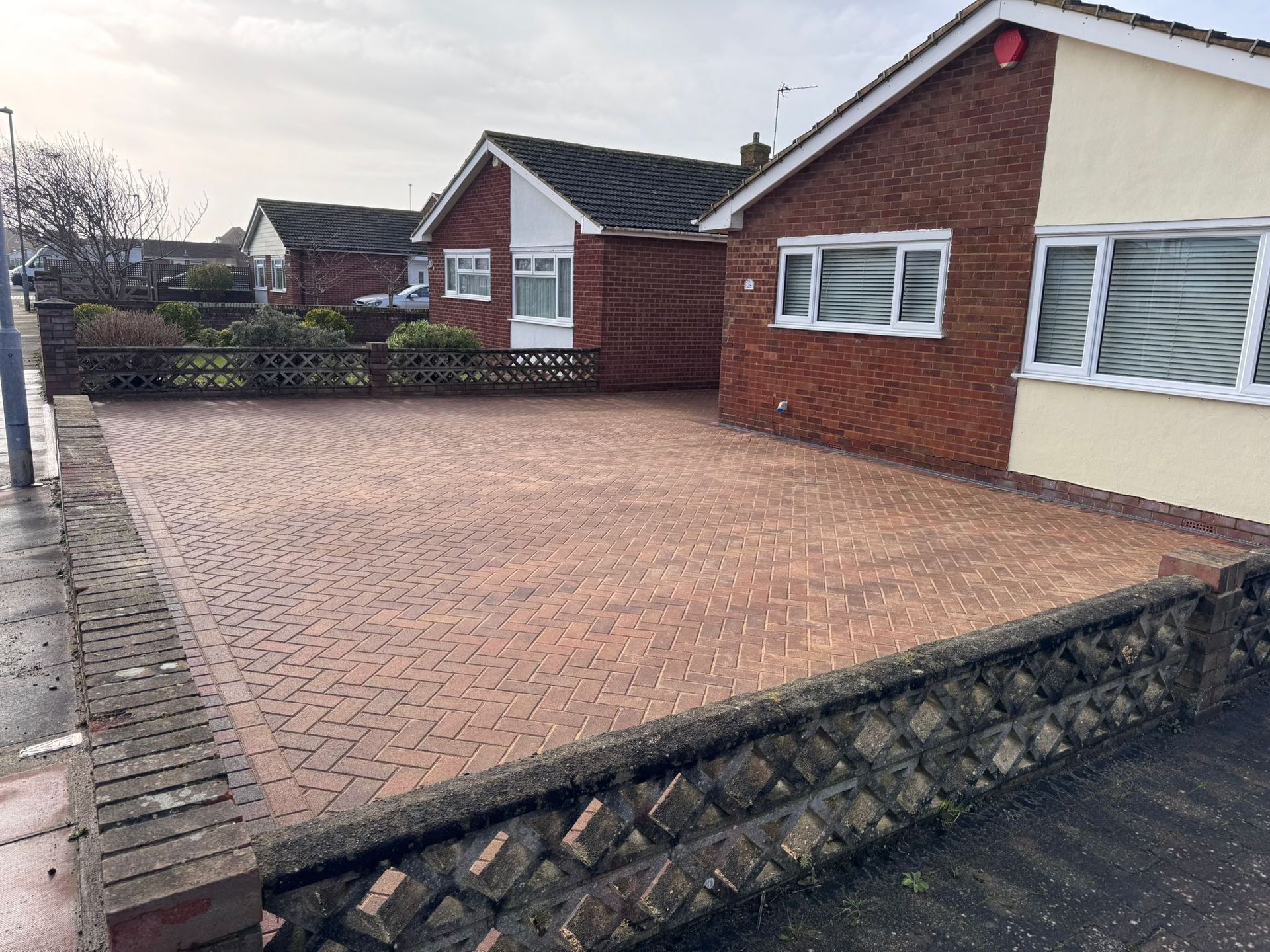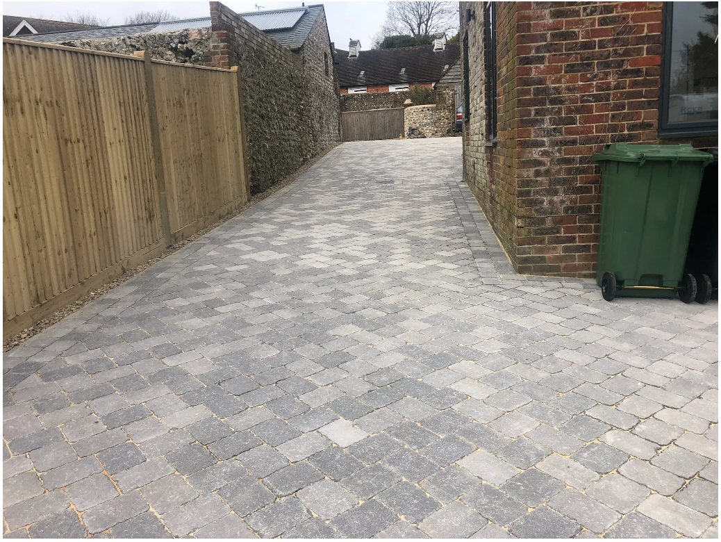 A nice standard brindle block paved driveway in Hailsham, East Sussex with raised border edge blocks.