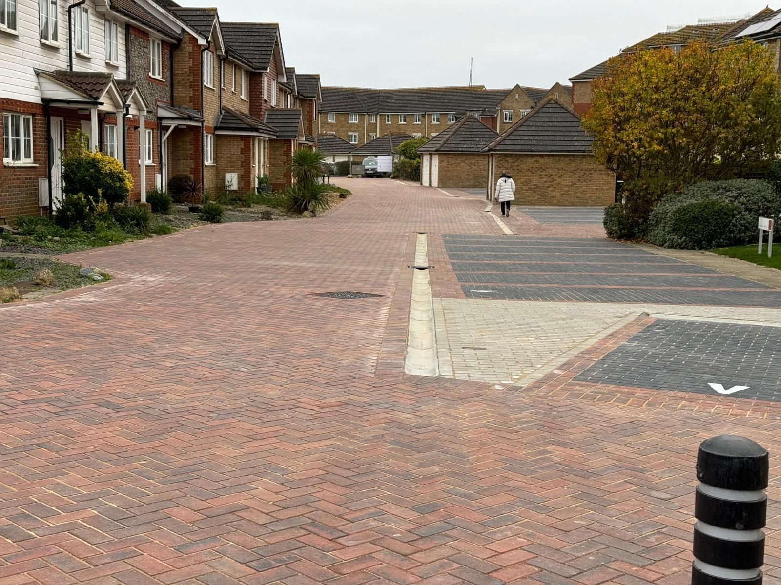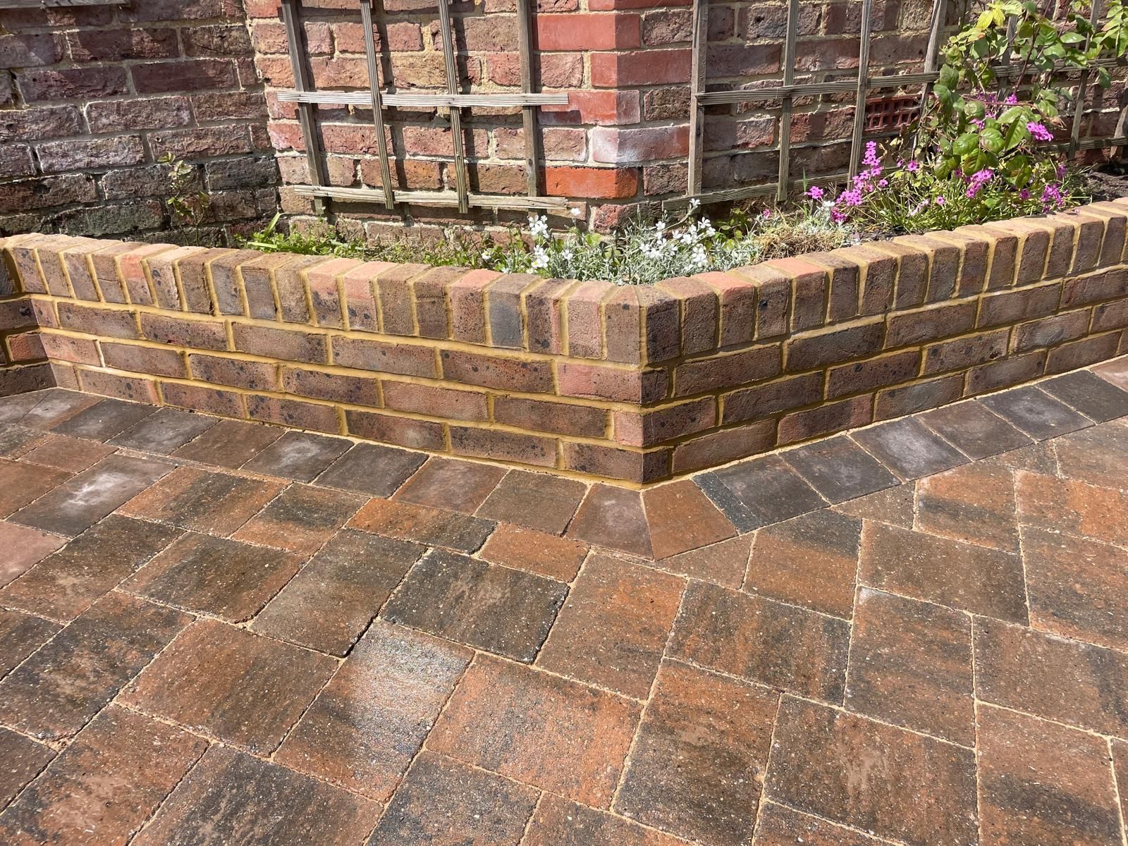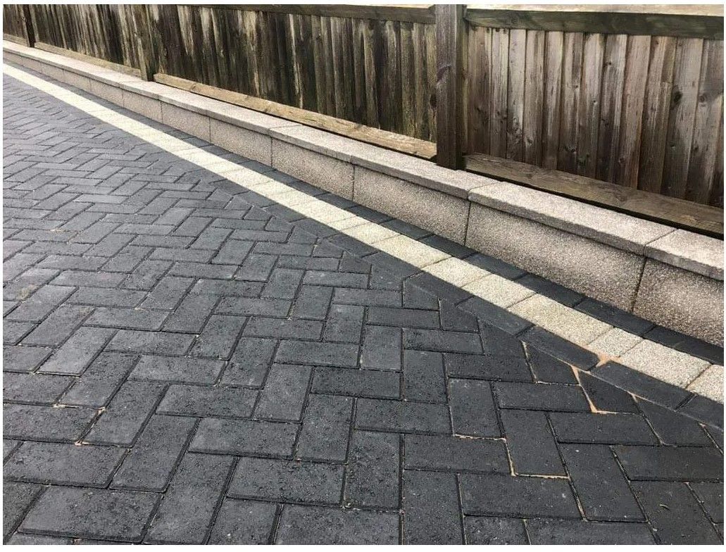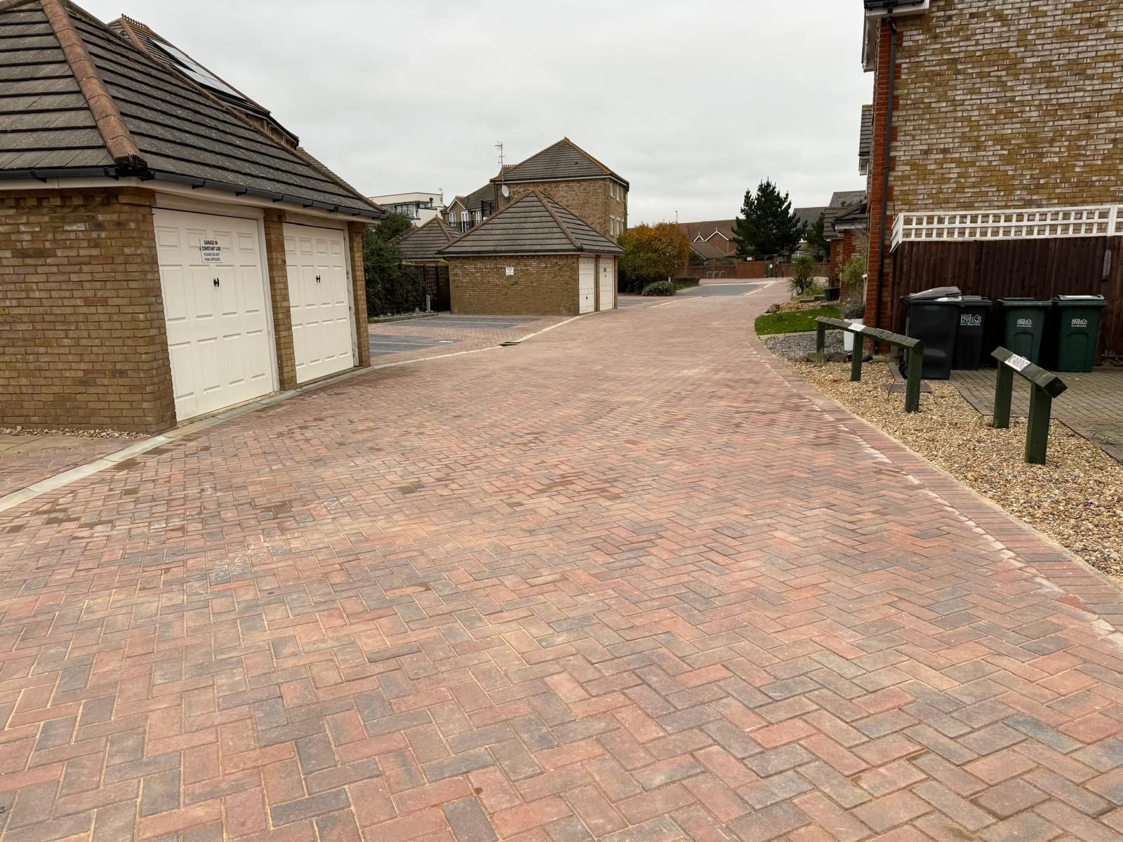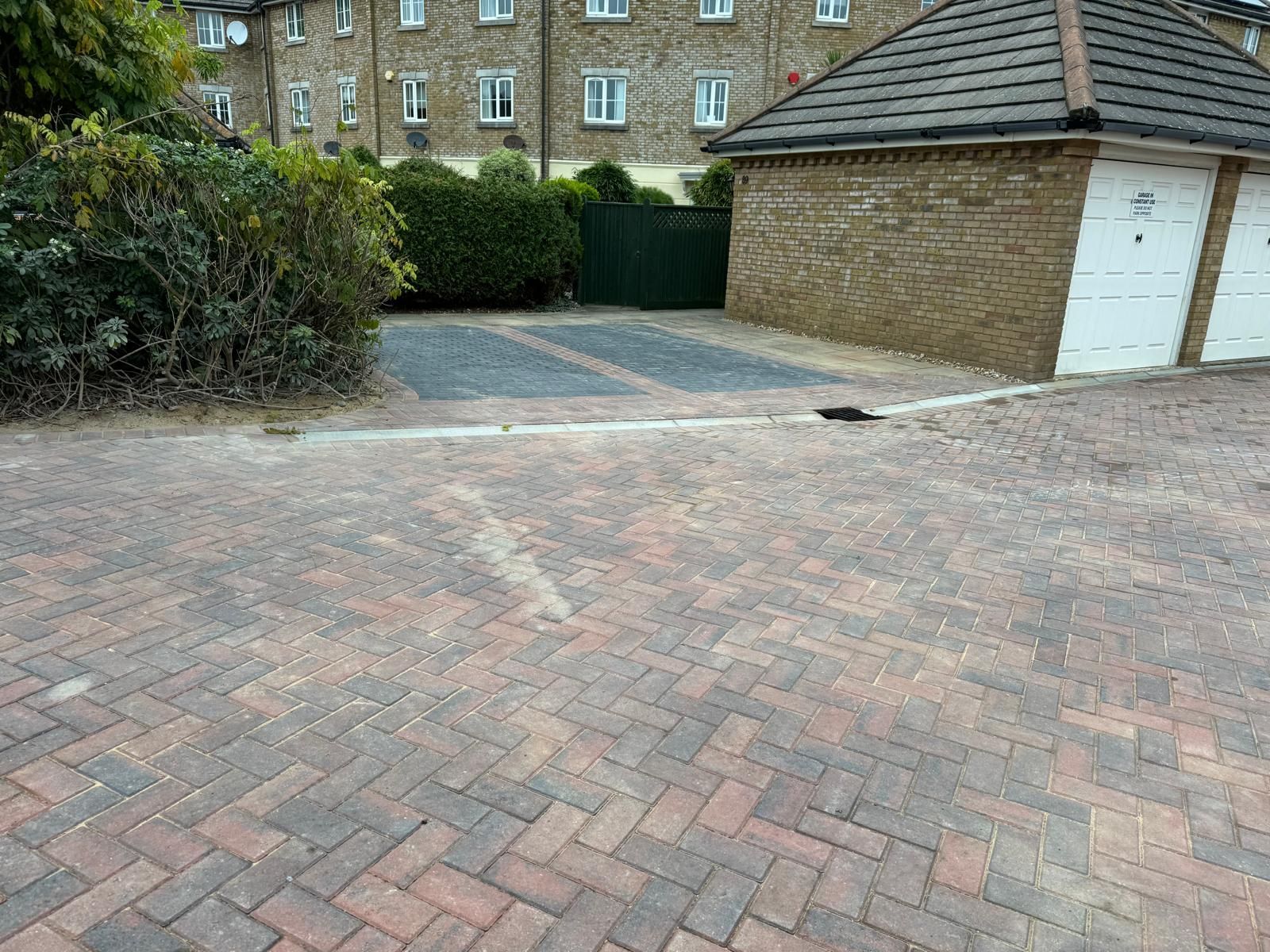 A nice standard brindle block paved driveway in Hailsham, East Sussex with raised border edge blocks.