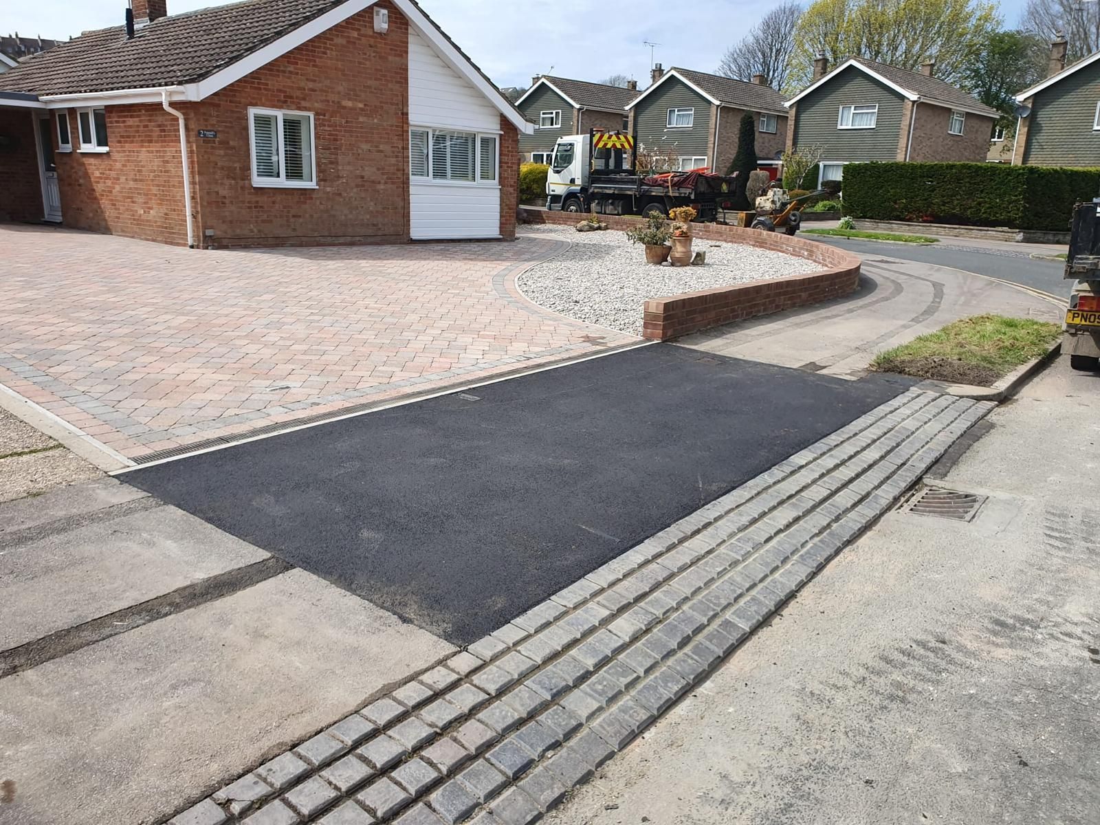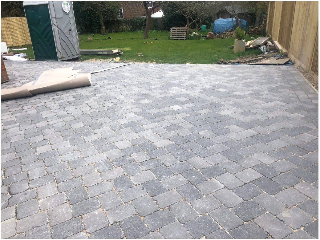 A new driveway in charcoal country cobble with a new dropped kerb.