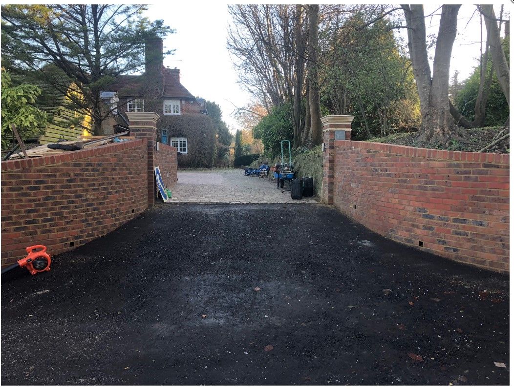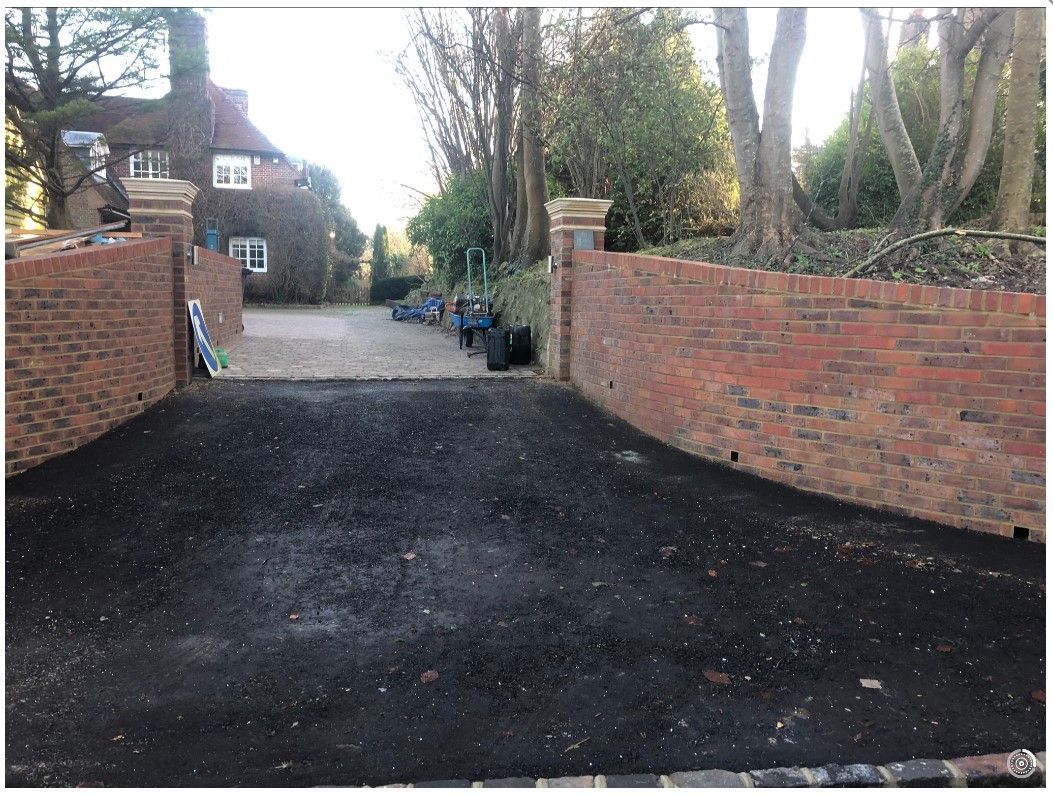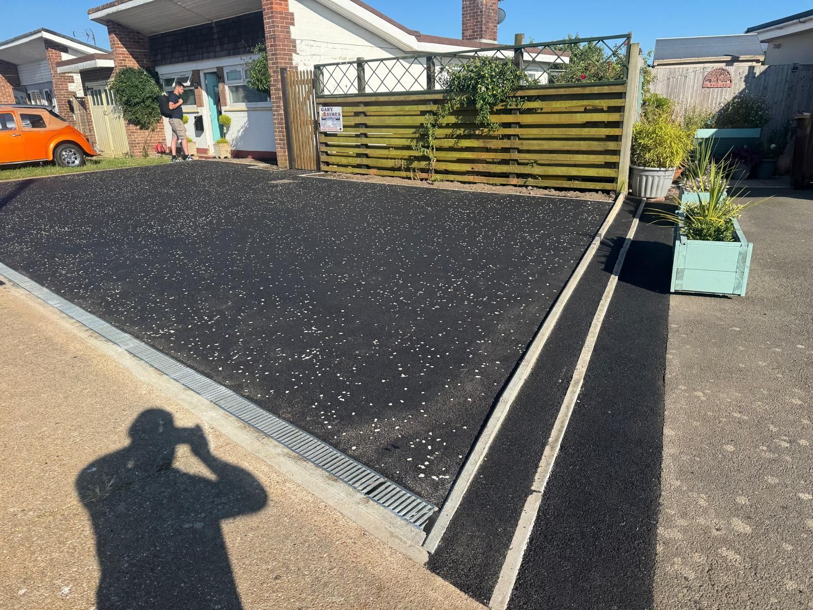A driveway in tarmac with white granite chipping and a new dropped curb.