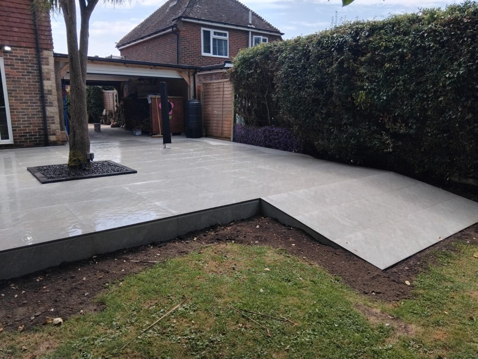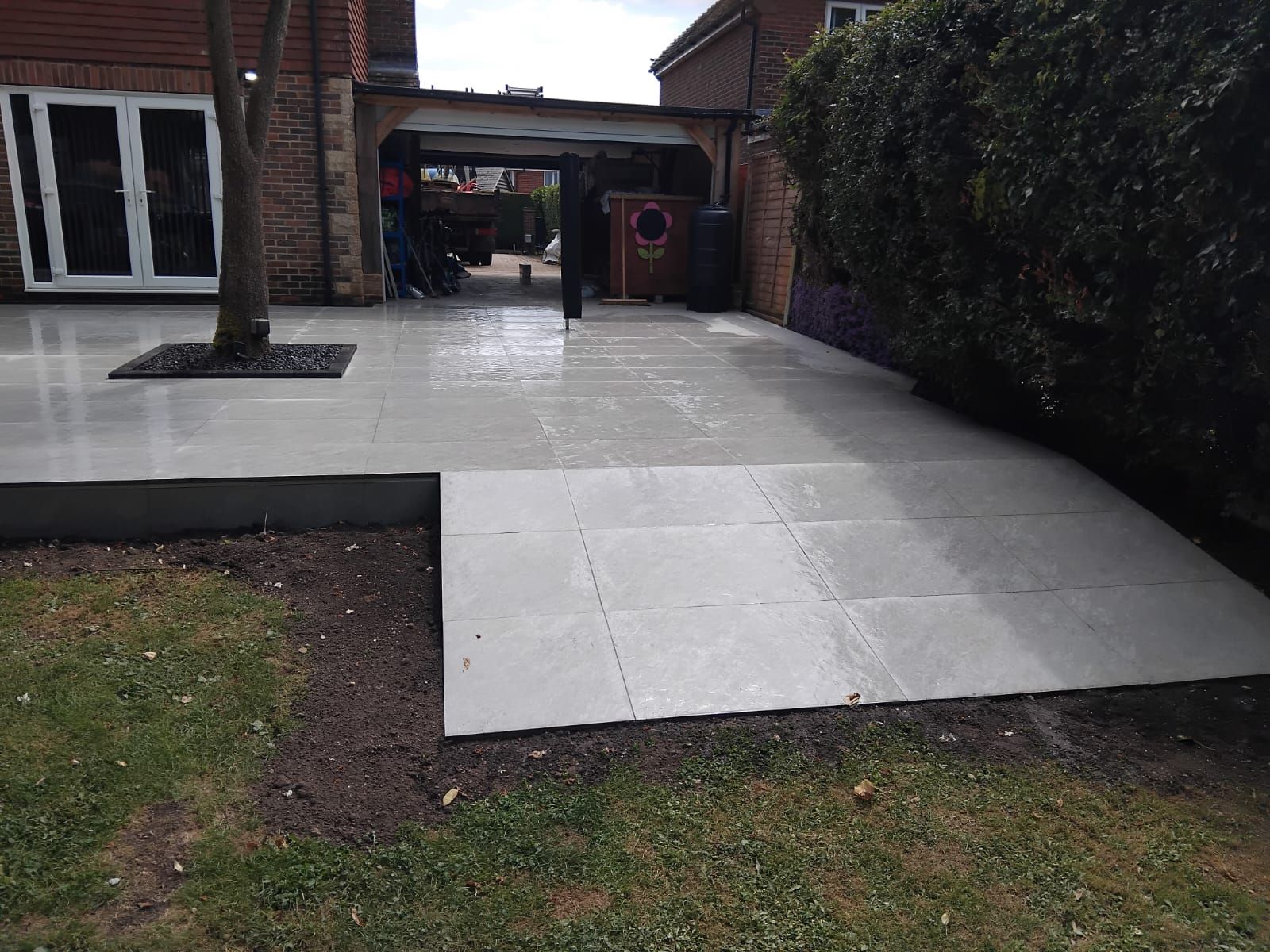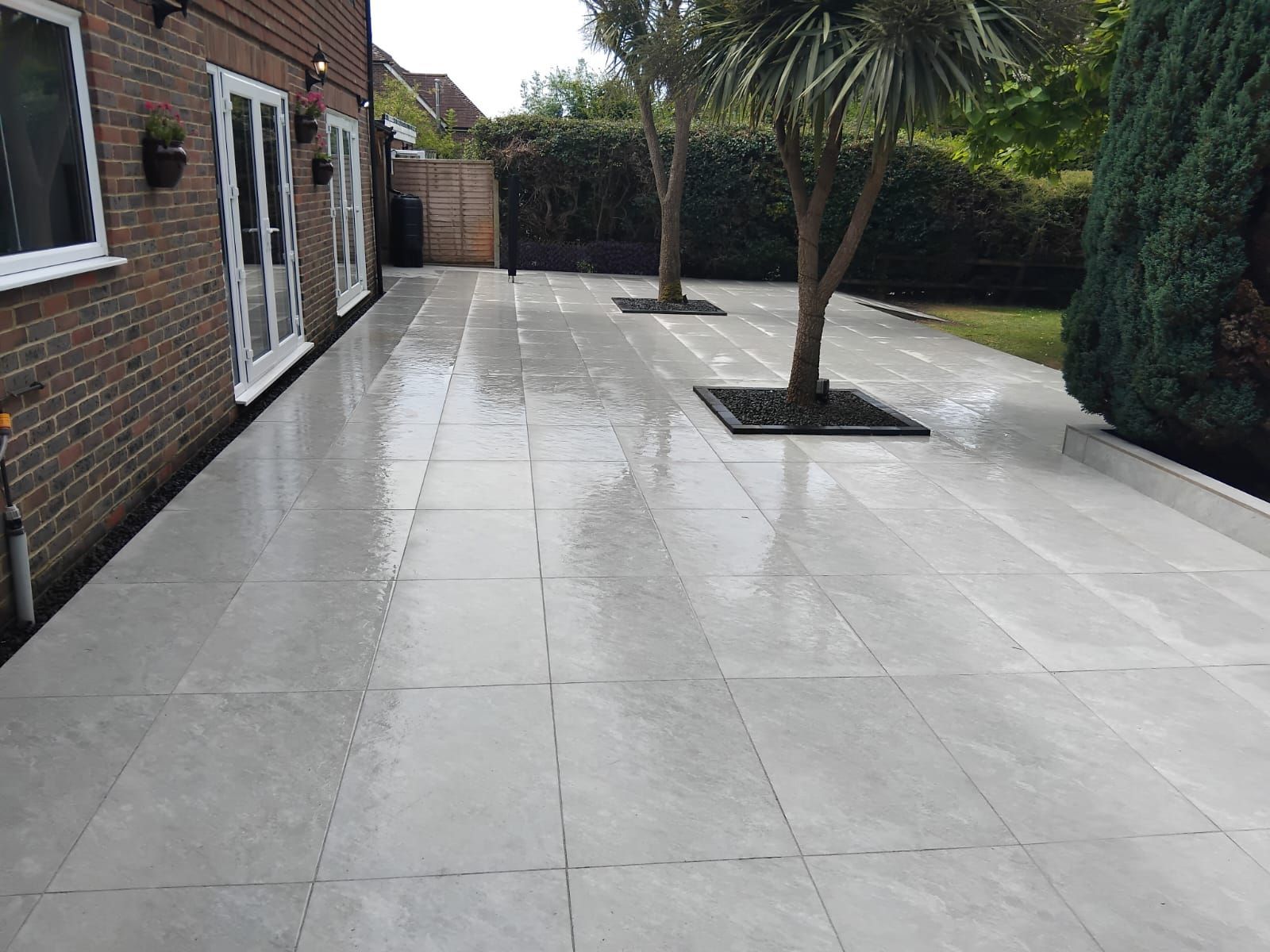 It’s a porcelain patio in quartz beige with light grey grout, with Staffordshire blue bricks to borders and basalt chippings to borders and abutments.