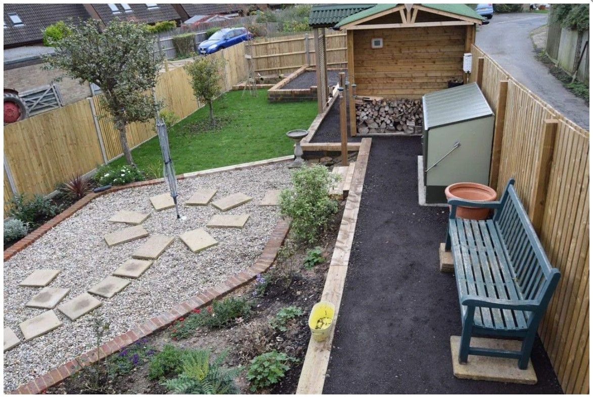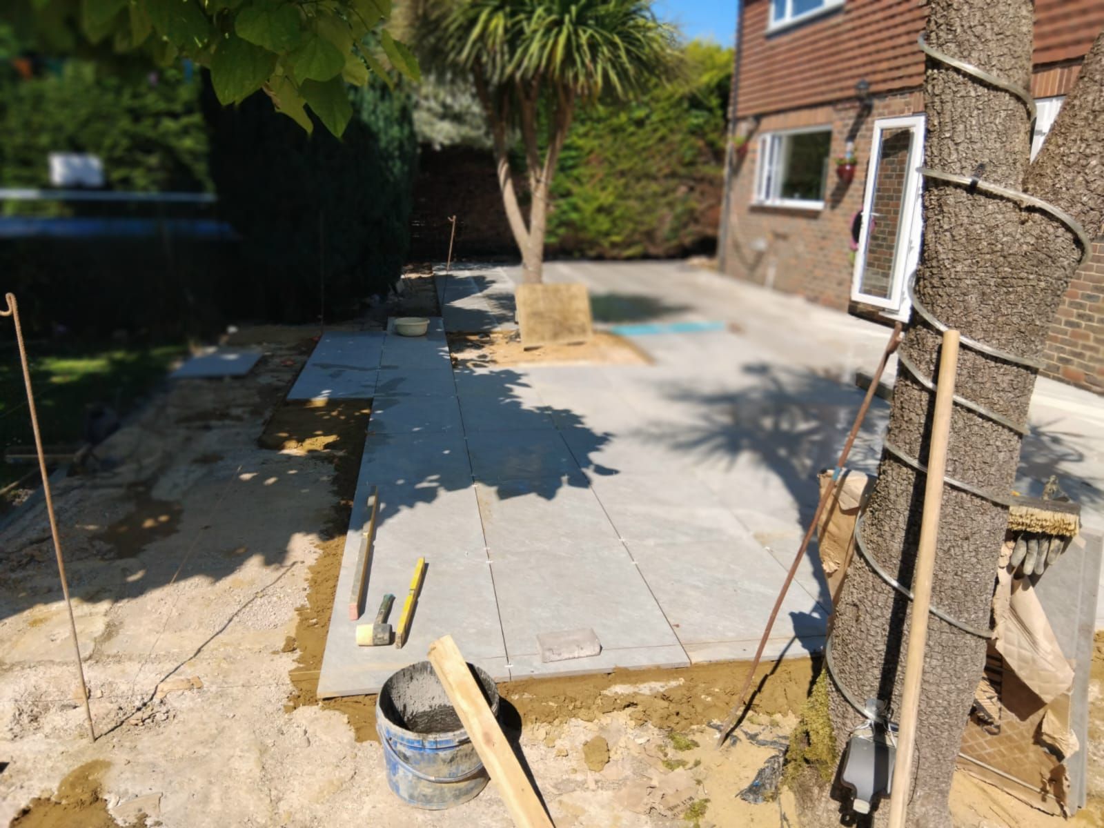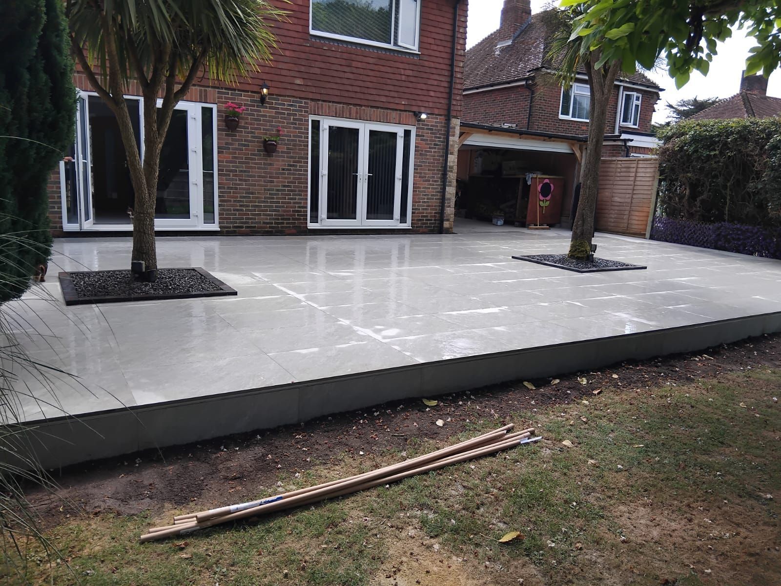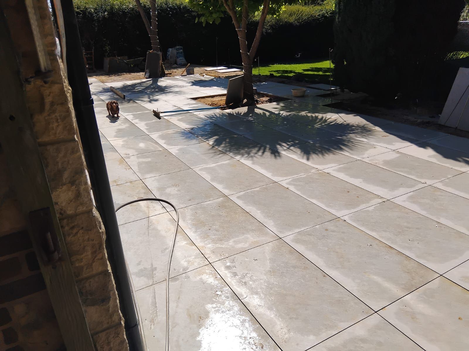 It’s a porcelain patio in quartz beige with light grey grout, with Staffordshire blue bricks to borders and basalt chippings to borders and abutments.