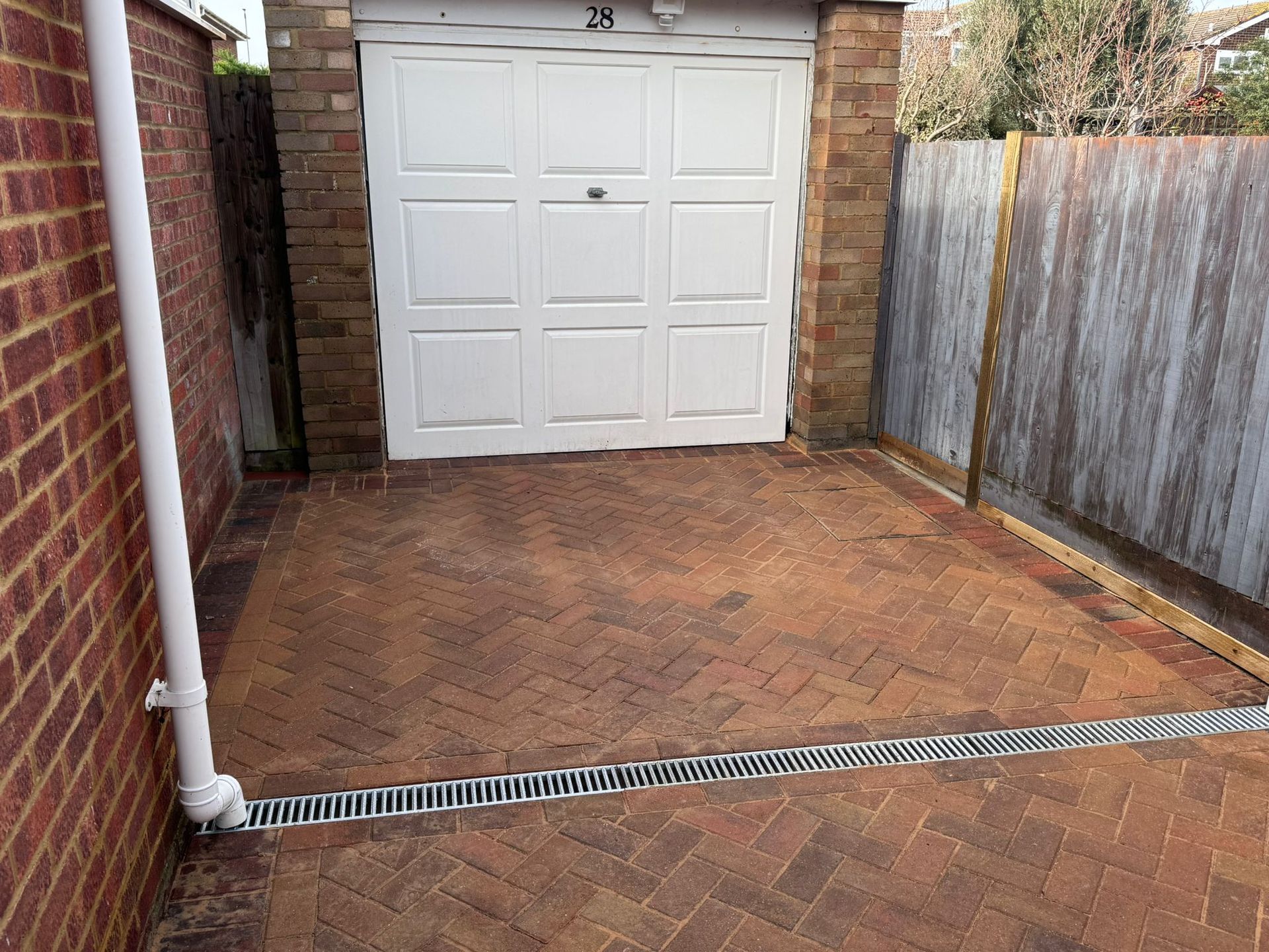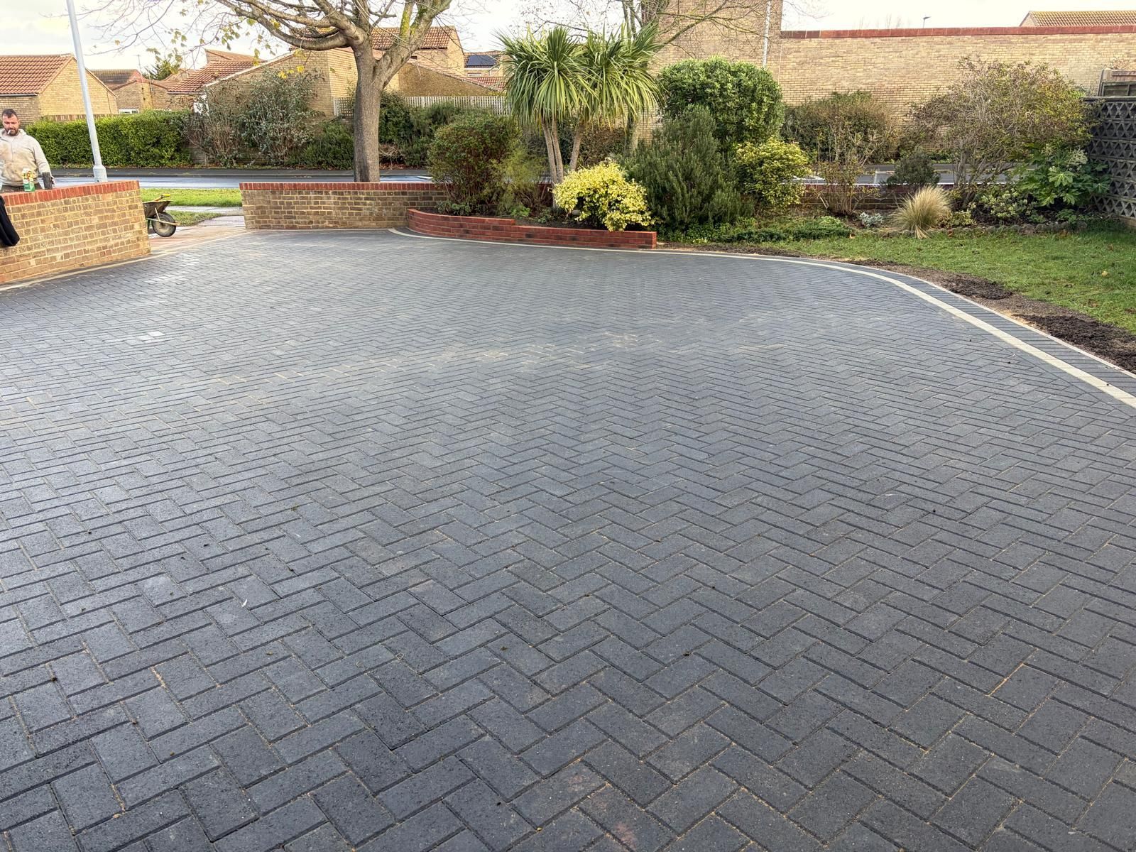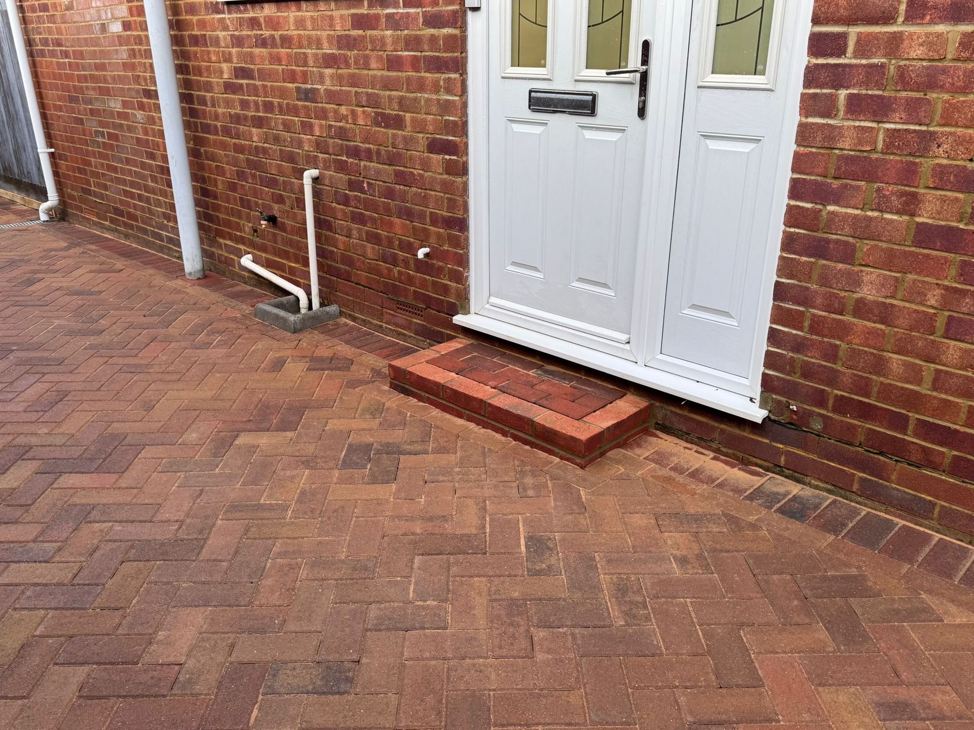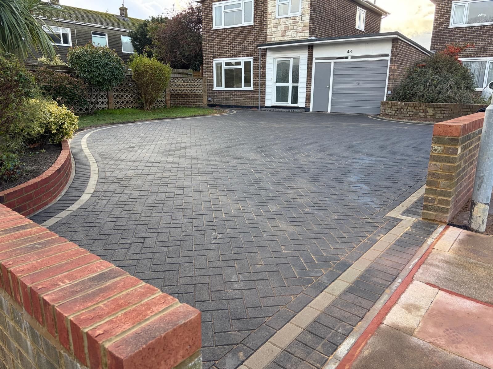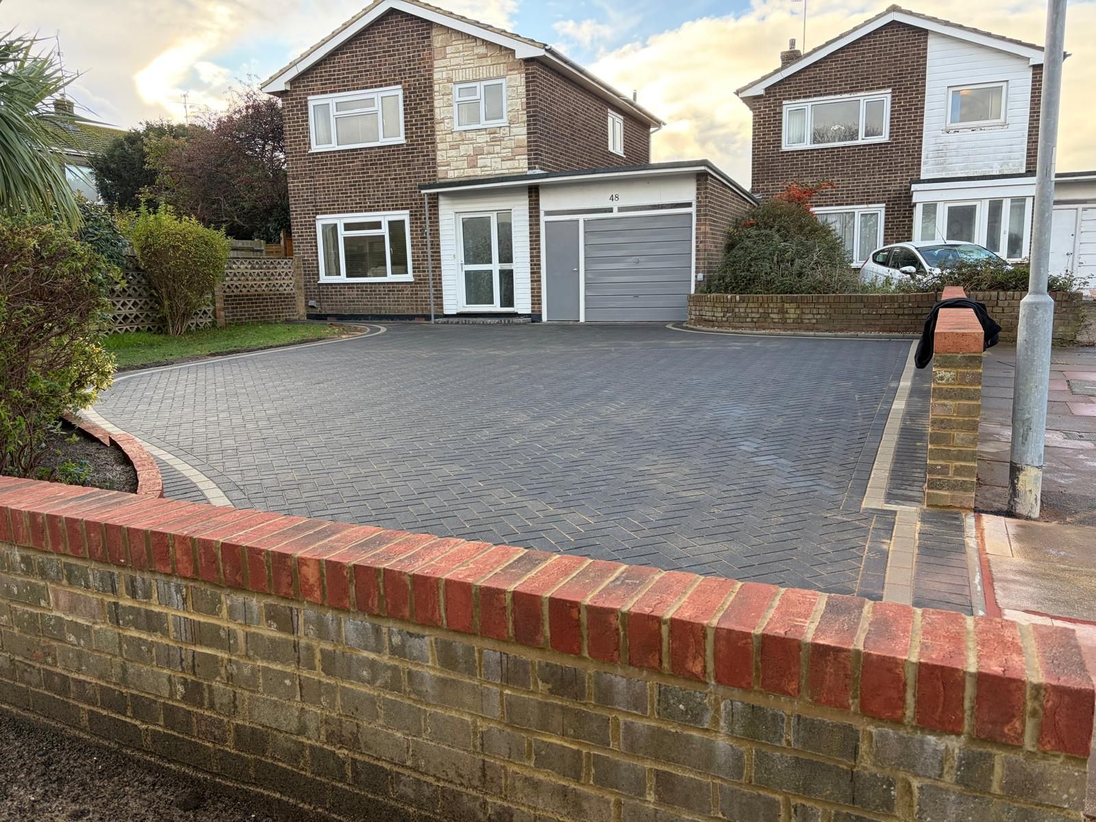 New driveway in standard block paving, brick walls re-pointed, with new brick laid on top. Langney, Eastbourne.